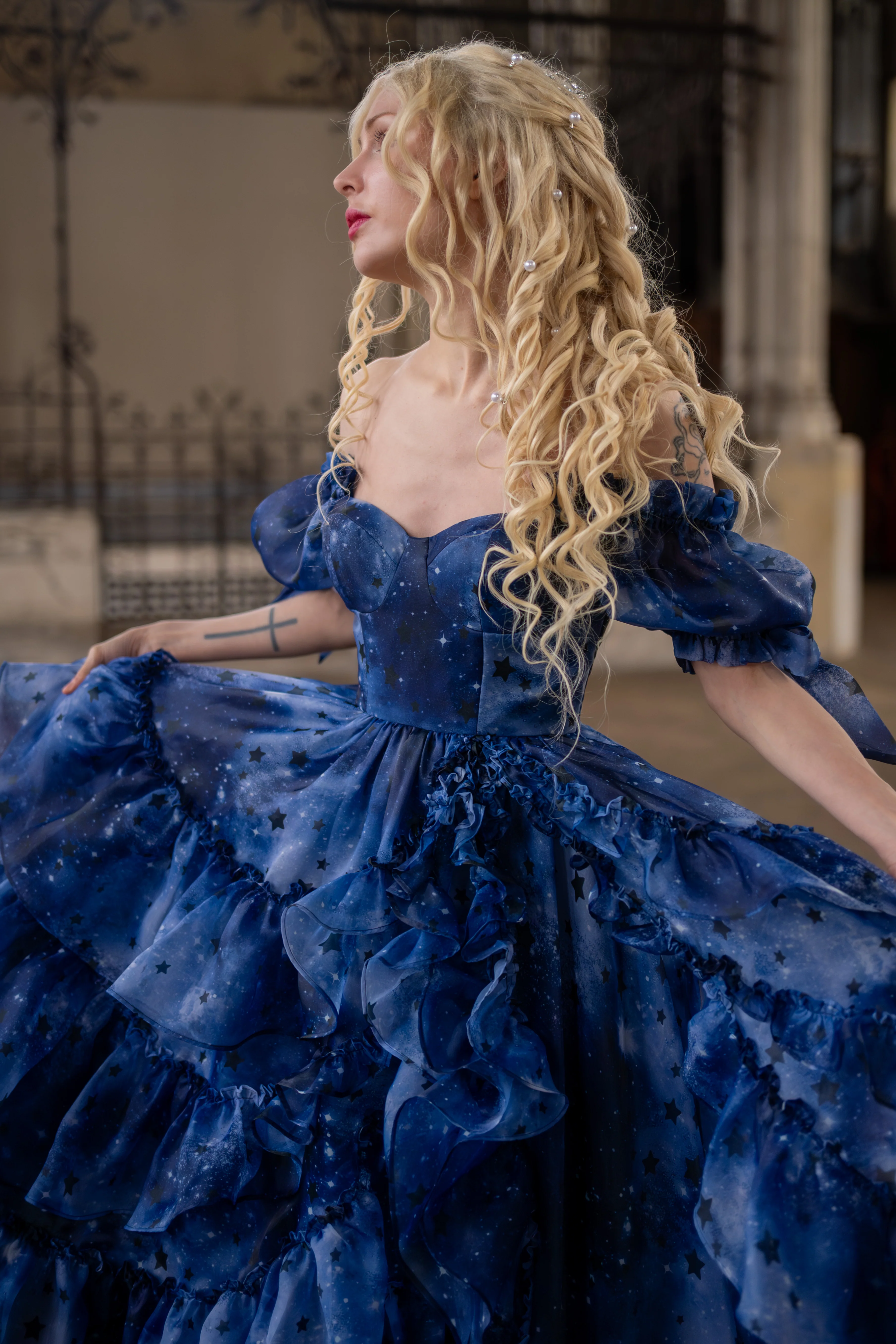 Adorned with the Codex Shadow print, a witchy celestial tapestry of swirling cosmos and deep ebony stars, the gown evokes hidden rituals, secret manuscripts, and arcane enchantments. Every fold, ruffle, and detail radiates dark opulence, baroque maximalism, and literary intrigue. The Mademoiselle Gown transforms its wearer into a figure of nocturnal power and couture sophistication - an ethereal embodiment of celestial mystery and dramatic elegance.