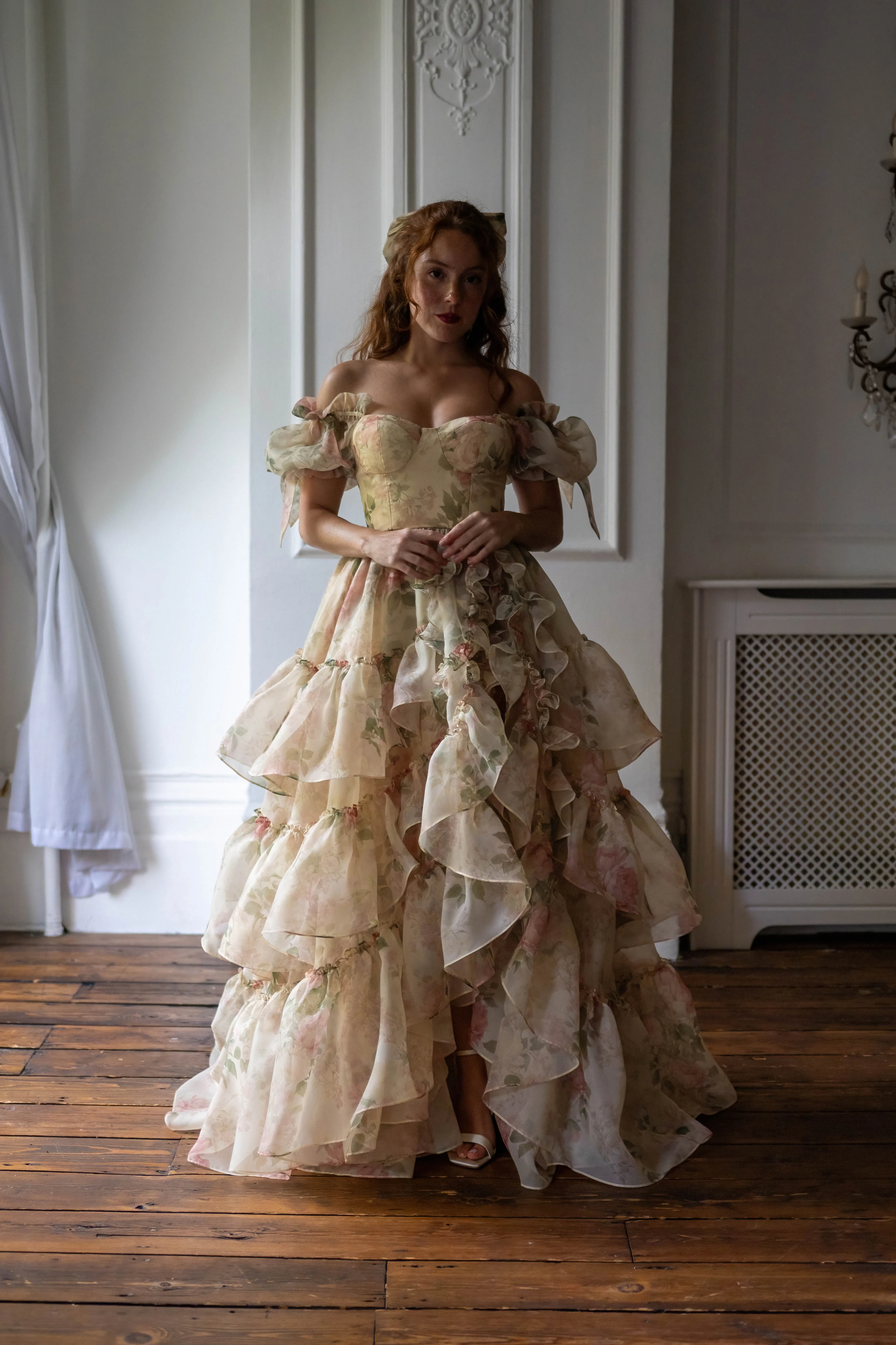 - Exquisitely romantic gown with 3 tiers of cascading ruffles