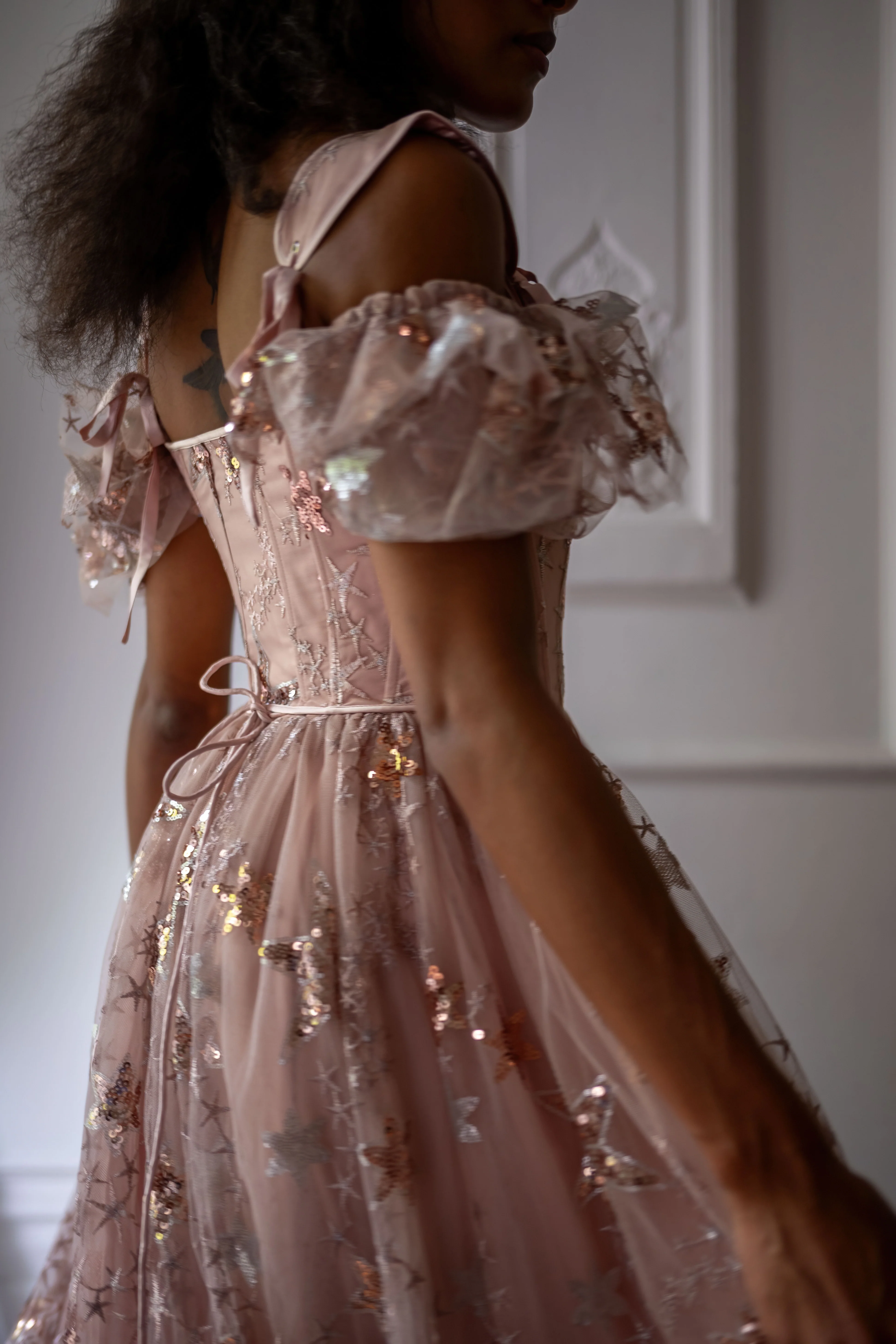 Destiny has its sights set on you with the Star-Crossed Lovers Thisbe Corset. Dripping in exquisite heavily encrusted tulle and shimmering rose gold sequin stars, this heavily boned corset will have you feeling like the leading lady of an ill-fated romance.