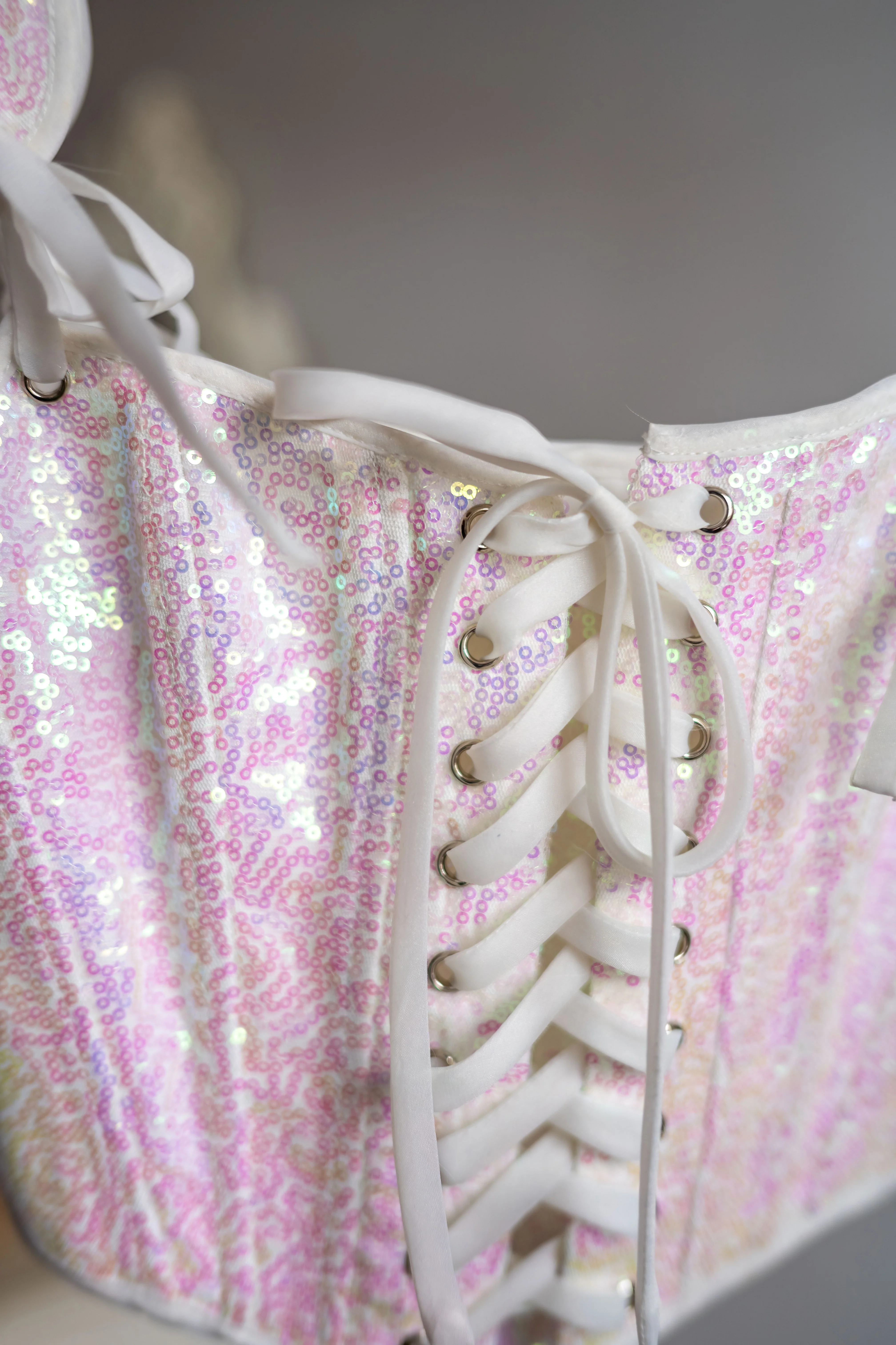 Slip into this otherworldly corset and you will feel instantly illuminated with an ethereal glows that surpasses heaven and all it's angels! Shimmering sequins evoke the mystical tears of unicorns, catching the eye with an ivory hue, and subtle glimmers of pink and baby blue crystal.